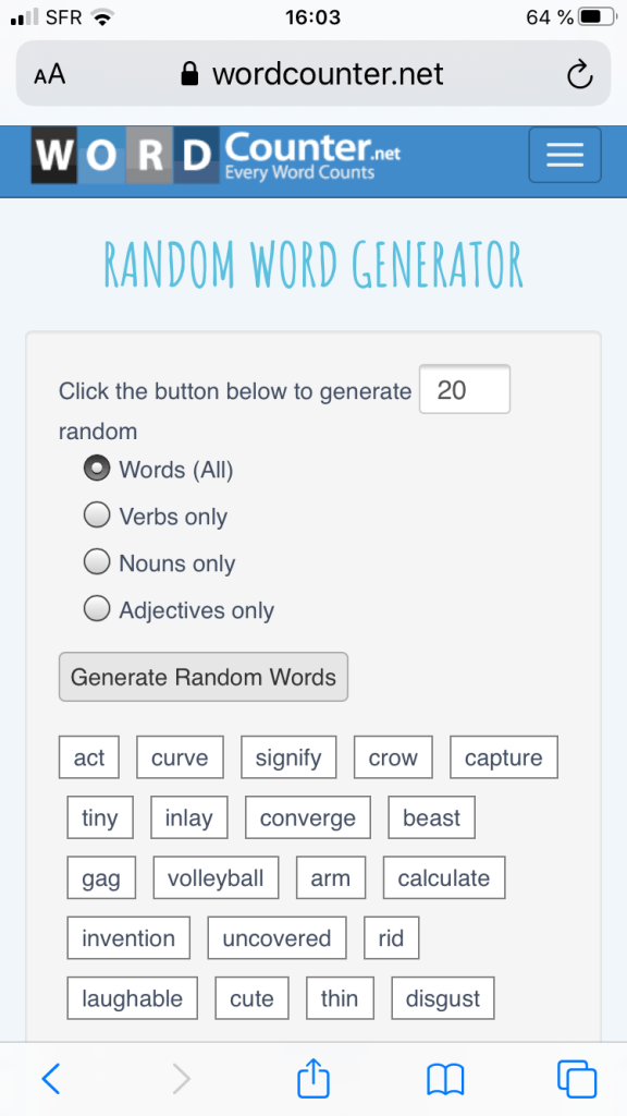 Utiliser au moins 5 mots parmi les 20 mots générés de façon aléatoire avec wordcounter.
